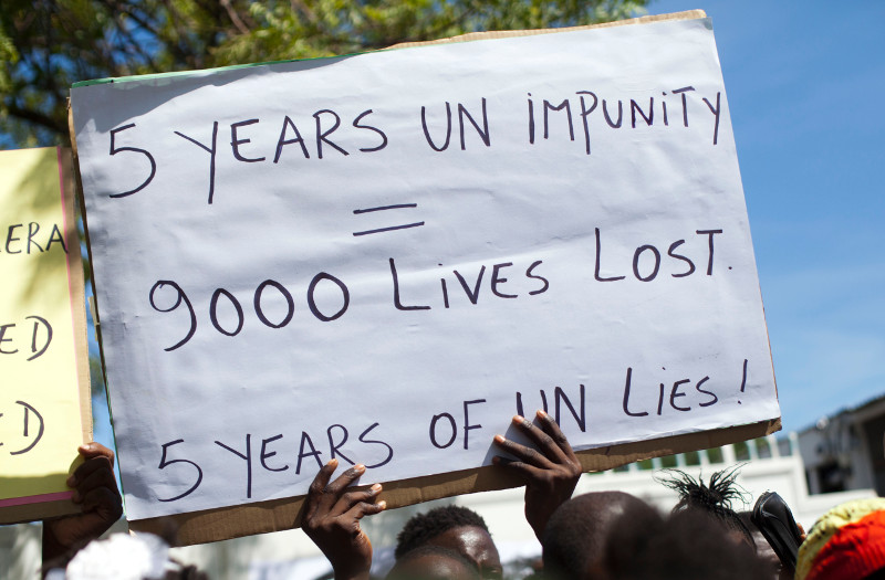 Ο τέως ΓΓ του ΟΗΕ Μπαν Γκι-μουν είχε αναγκαστεί να ζητήσει συγγνώμη από τους Αϊτινούς αφού εργαστηριακές εξετάσεις απέδειξαν ότι τη χολέρα μετέφεραν στην Αϊτή κυανόκρανοι από το Νεπάλ, που είχαν αναπτυχθεί στη χώρα μετά τον σεισμό του 2010.