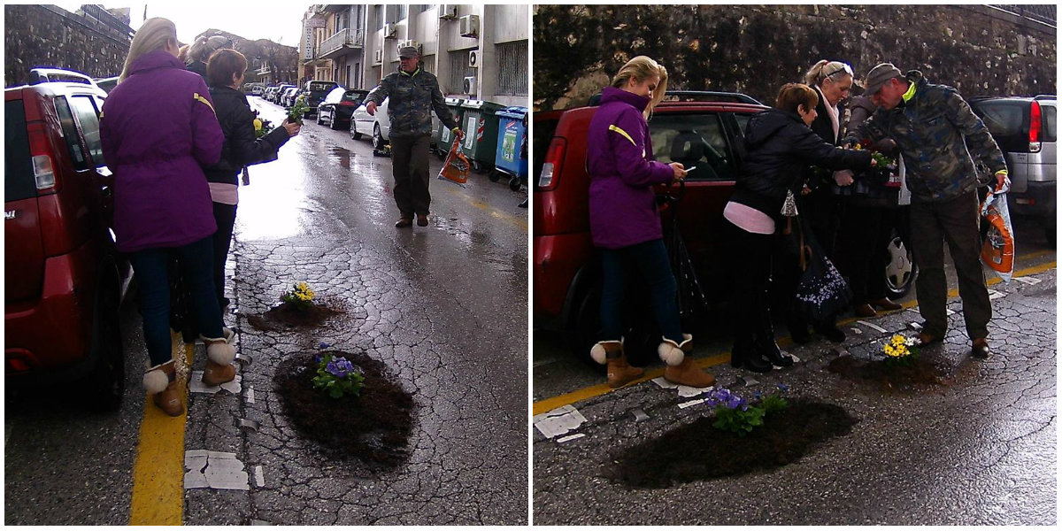Παρά τις έντονες βροχοπτώσεις, κάτοικοι της Κέρκυρας αποφάσισαν να γεμίσουν τις λακκούβες στους δρόμους με λουλούδια.
